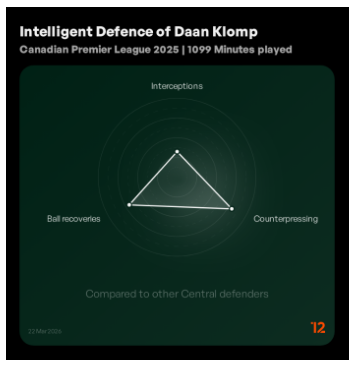 Particularly by limiting the quality of chances created by opposition, Klomp does show a strong defensive capability in chance prevention. He is particularly adept at utilising the ball intelligently to distribute in low-risk areas or with good quality delivery.